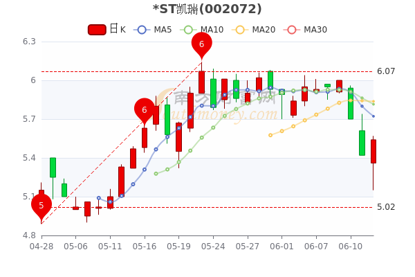 6月14日ST凯瑞(002072)开盘报5.36元,截至15时,该股报5.54元涨2.21%,成交2989.5万元,换手率2.2%。