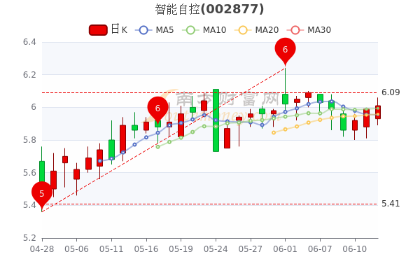6月14日消息,智能自控7日内股价下跌1.33%,截至15点,该股报6.01元,涨0.33%,总市值为19.99亿元。