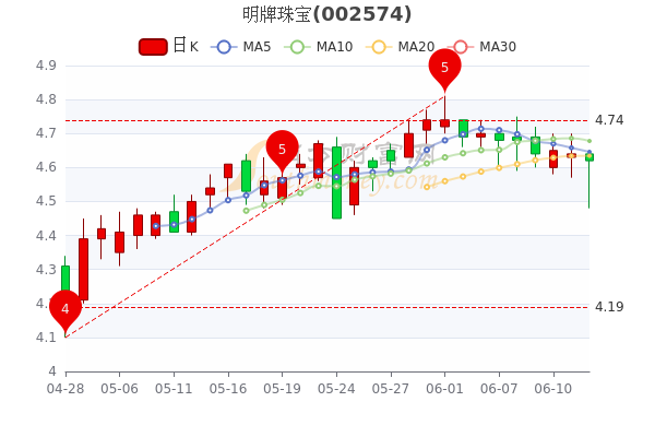 6月14日消息,明牌珠宝开盘报价4.64元,收盘于4.62元。3日内股价下跌0.65%,总市值为24.39亿元。
