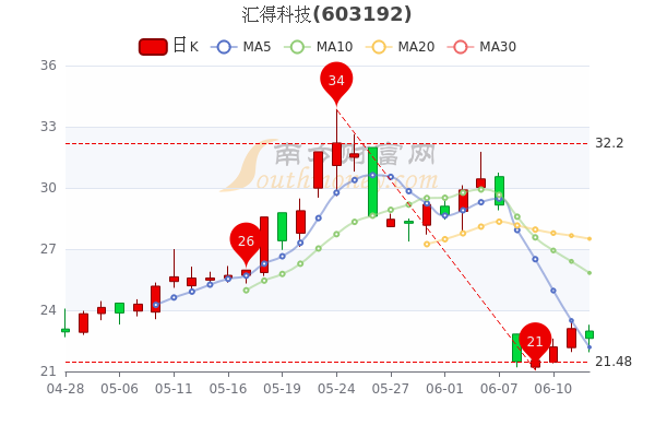 6月14日盘后消息,汇得科技开盘报价22.98元,收盘于22.62元,成交额5037.8万元。