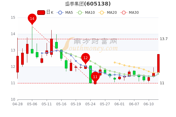 6月14日消息,盛泰集团开盘报价11.64元,收盘于12.76元,涨10%。当日最高价12.76元,市盈率22.39。