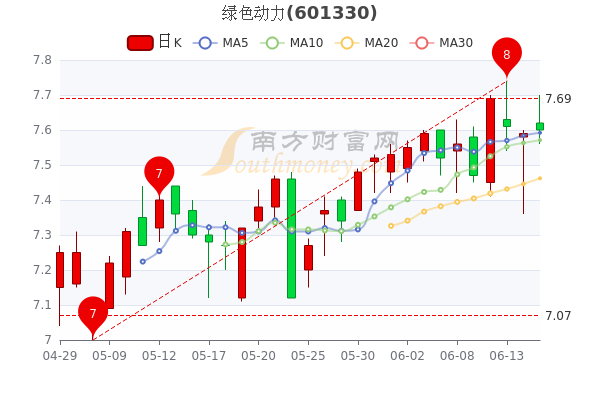6月15日消息,绿色动力7日内股价上涨1.05%,截至15时,该股报7.65元,涨0.79%,总市值为105.9亿元。