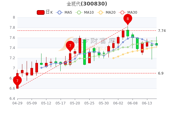 6月15日金现代(300830)开盘报7.49元,成交3369.82万元,换手率1.87%。