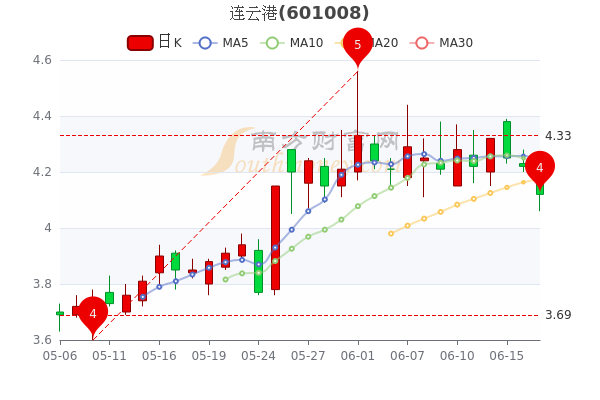 截止下午三点收盘,连云港报4.12元,跌2.37%,总市值51.11亿元。