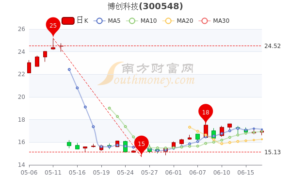 6月17日消息,博创科技截至15点,该股涨0.53%,报17元;5日内股价下跌3.71%,市值为44.39亿元。