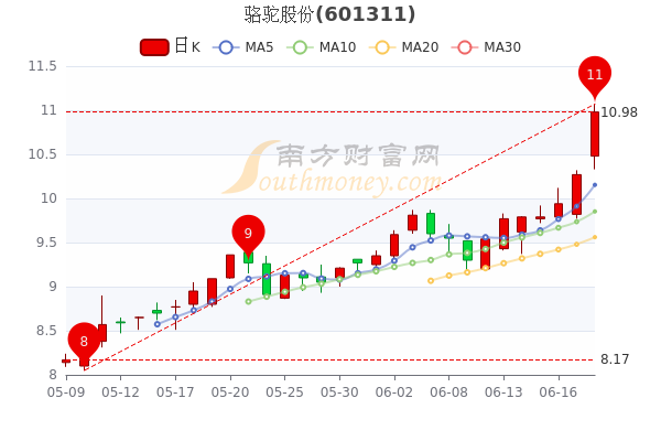 6月20日骆驼股份盘后消息,7日内股价上涨13.11%,今年来涨幅下跌-37.52%,最新报10.98元,涨6.91%,市值为128.81亿元。