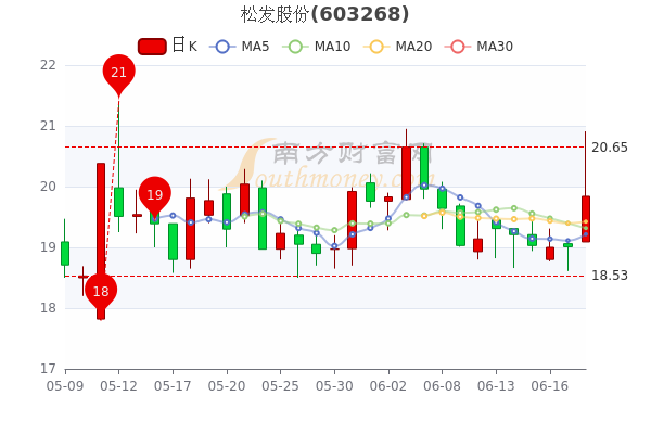 6月20日消息,松发股份开盘报价19.09元,收盘于19.84元,涨4.37%。当日最高价20.91元,最低达19.09元,总市值24.64亿。