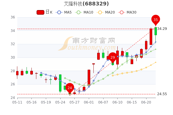 6月22日消息,艾隆科技开盘报价34.5元,收盘于32.3元,跌5.8%。当日最高价34.5元,市盈率25.27。