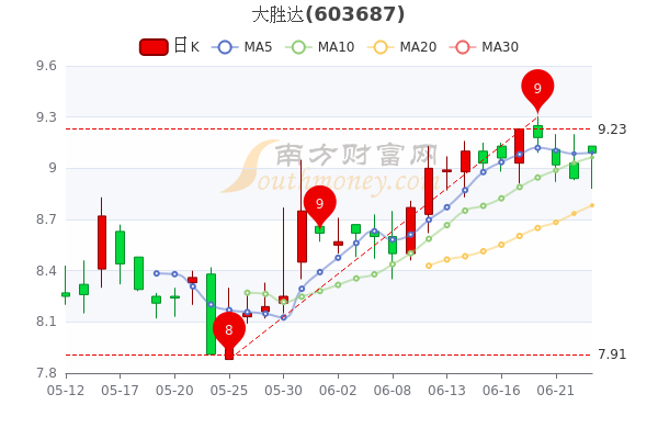6月23日大胜达开盘报价9.13元,收盘于9.09元,涨1.68%。当日最高价为9.13元,最低达8.88元,成交量1.43万手,总市值为38.1亿元。