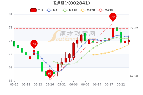 6月24日盘后最新消息,视源股份7日内股价下跌0.43%,截至15时收盘,该股涨0.09%报75.09元 。