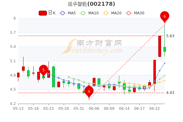 6月24日延华智能(002178)开盘报5.39元,截至15时,该股报5.3元跌5.86%,成交6.95亿元,换手率17.73%。