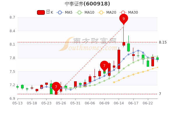 6月24日中泰证券开盘报价7.81元,收盘于7.76元,跌0.77%。当日最高价为7.84元,最低达7.71元,成交量36.13万手,总市值为540.77亿元。