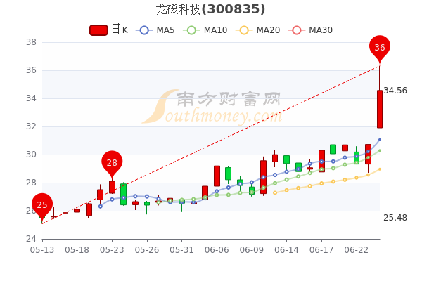 6月24日收盘最新消息,龙磁科技7日内股价上涨15.91%,截至15点,该股涨12.5%报34.56元 。