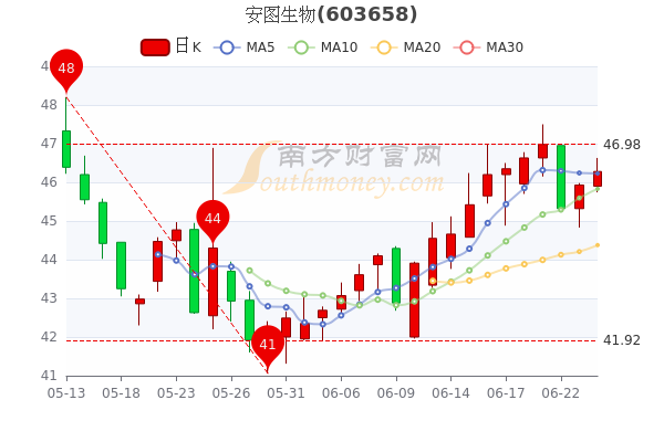 6月24日收盘最新消息,安图生物昨收45.93元,截至15时,该股涨0.76%报46.28元 。