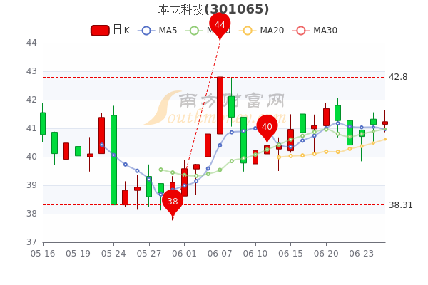 6月27日消息,本立科技5日内股价下跌1.36%,最新报41.23元,成交量2707手,总市值为29.03亿元。