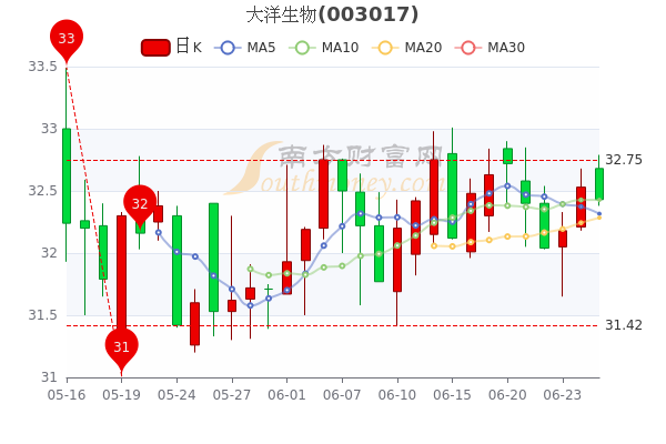 6月27日消息,大洋生物最新报价32.43元,3日内股价上涨1.51%;今年来涨幅下跌-35.14%,市盈率为27.92。