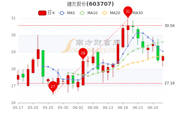 6月28日健友股份开盘报价28.5元,收盘于28.74元,涨0.77%。当日最高价为28.83元,最低达28.15元,成交量2.93万手,总市值为357.5亿元。