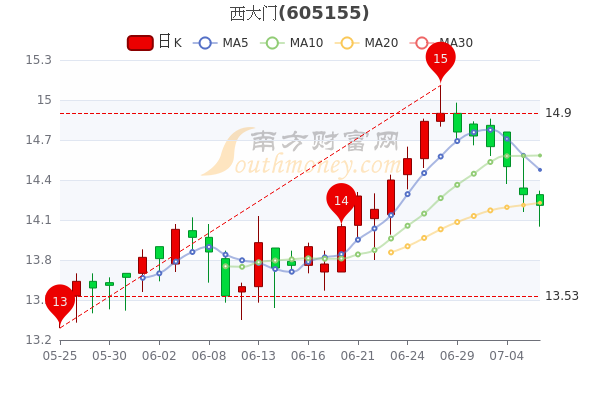 7月6日盘后消息,西大门最新报价14.11元,3日内股价下跌2.04%,市盈率为15.28。