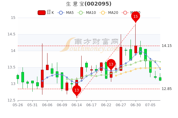 7月7日生意宝(002095)开盘报13.19元,截至15点,该股报13.1元跌0.68%,成交3070.76万元,换手率0.93%。