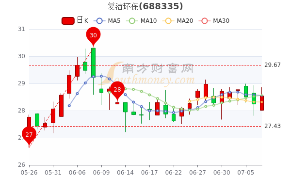 7月7日消息,复洁环保收盘于28.54元,涨1.06%。7日内股价上涨0.91%,总市值为20.7亿元。