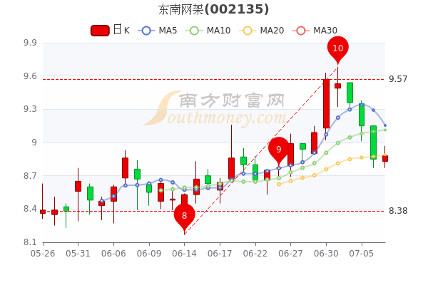 7月7日东南网架3日内股价下跌3.04%,截至15时收盘,该股报8.88元涨0.34%,成交1.32亿元,换手率1.54%。
