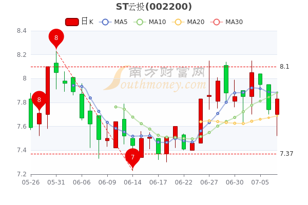 7月7日盘后消息,ST云投收盘于7.82元,涨1.03%。今年来涨幅下跌-1.02%,总市值为14.42亿元。