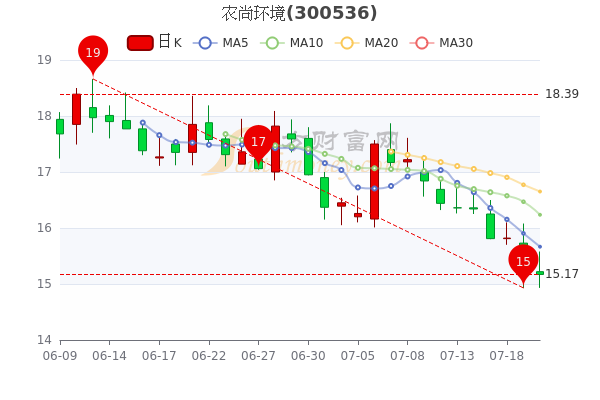 7月20日消息,农尚环境5日内股价下跌7.71%,最新报15.17元,成交量3.9万手,总市值为44.49亿元。