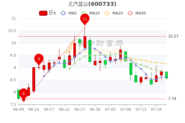 7月20日盘后消息,北汽蓝谷开盘报价8.83元,收盘于8.57元。7日内股价上涨1.87%,总市值为367.42亿元。