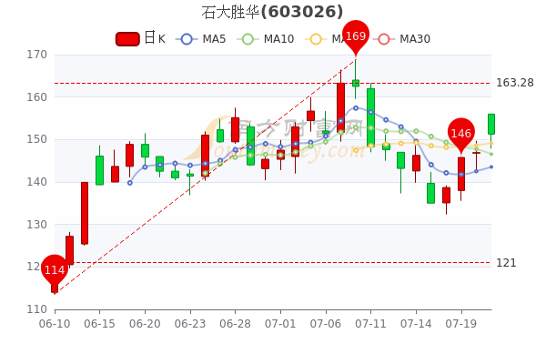 7月21日盘后消息,石大胜华开盘报价156元,收盘于151.28元。5日内股价上涨10.74%,总市值为306.61亿元。
