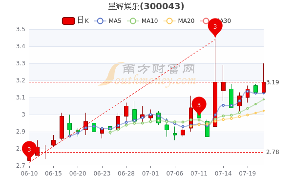 7月21日消息,星辉娱乐开盘报3.13元,截至15点收盘,该股涨1.92%,报3.19元。换手率6.16%,振幅1.917%。