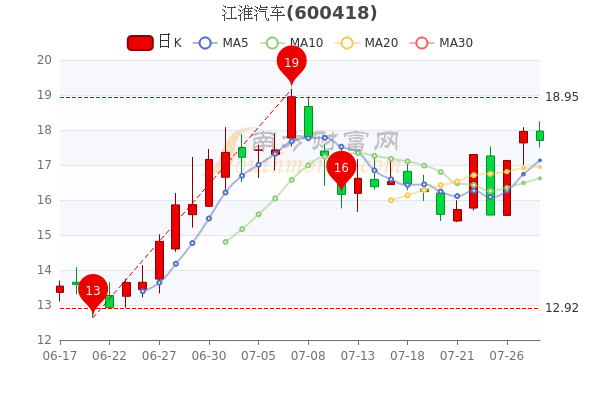 北京时间7月28日,江淮汽车开盘报价17.97元,收盘于17.7元,相比上一个交易日的收盘跌1.45%报17.96元。当日最高价18.25元,最低达17.5元,成交量109.05万手,总市值386.57亿元。