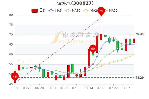 北京时间7月29日,上能电气开盘报价66元,涨3.83%,最新价67.96元。当日最高价为70.07元,最低达66元,成交量1642.72万,总市值为161.47亿元。
