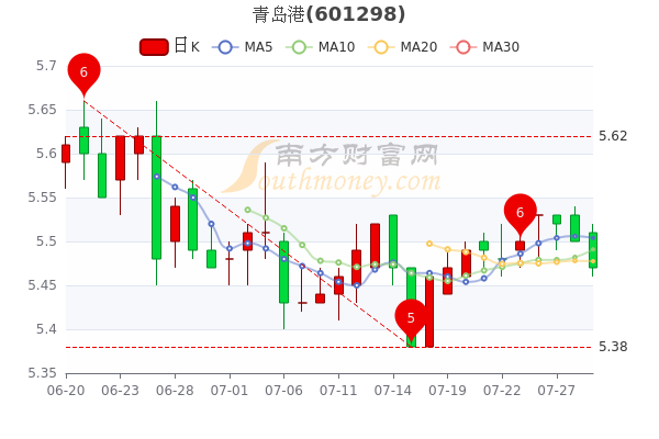 7月29日消息,青岛港截至15点,该股跌0.55%,报5.47元;5日内股价下跌0.18%,市值为355.06亿元。