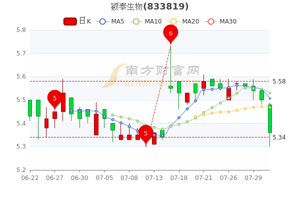 8月2日晚间复盘消息,颖泰生物开盘报价5.48元,收盘于5.36元。5日内股价下跌3.73%,总市值为65.7亿元。