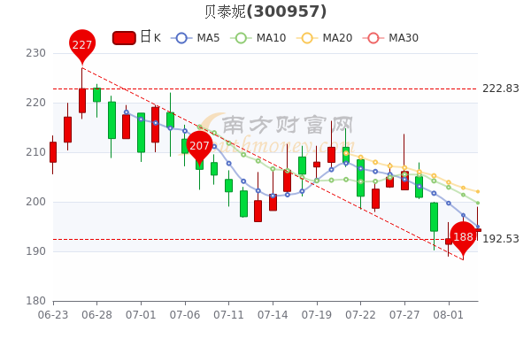 8月3日盘后消息,贝泰妮5日内股价下跌3.29%,截至15时收盘,该股报196.53元,涨1.87%,总市值为823.9亿元。