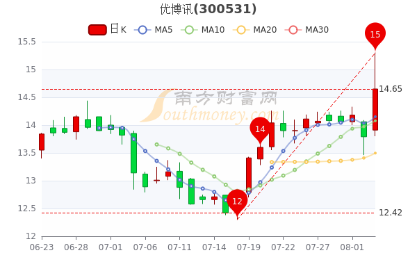 8月3日消息,优博讯收盘于14.65元,涨6.24%。7日内股价上涨5.12%,总市值为48.34亿元。
