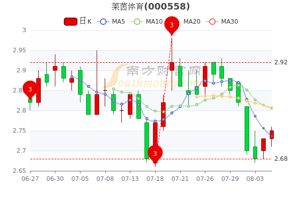 8月5日收盘消息,莱茵体育最新报价2.75元,涨0.73%,3日内股价上涨2.55%;今年来涨幅下跌-54.18%,市盈率为-39.29。