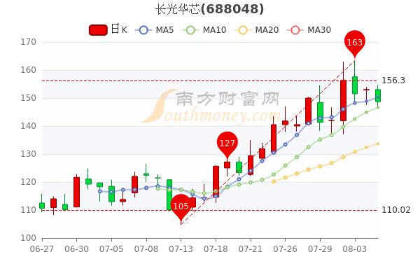 8月5日,长光华芯开盘报价153元,收盘于147.9元,跌3.36%。当日最高价为154.6元,最低达146.2元,成交量1.88万手,总市值为201.64亿元。