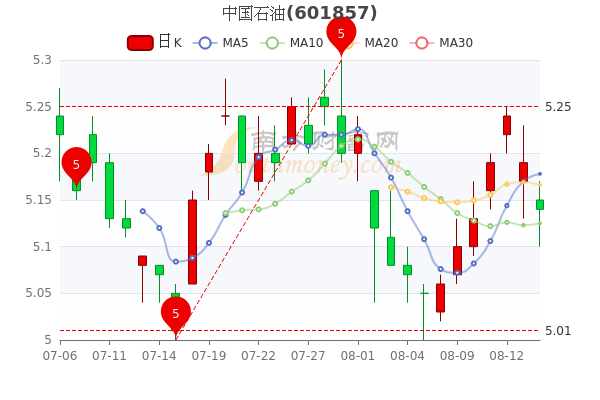 8月16日,中国石油开盘报价5.15元,收盘于5.14元,跌0.96%。当日最高价为5.17元,最低达5.1元,成交量91.28万手,总市值为9407.28亿元。