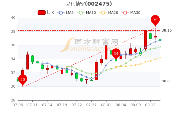8月16日消息,立讯精密5日内股价上涨5.3%,最新报36.55元,成交量62.33万手,总市值为2595.4亿元。