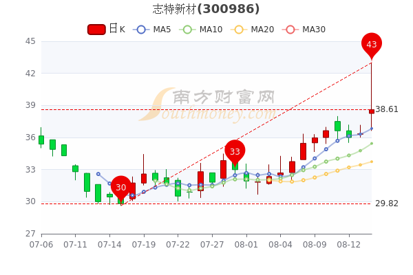 8月16日消息,志特新材截至15时收盘,该股涨6.25%,报38.61元,5日内股价上涨5.1%,总市值为63.28亿元。