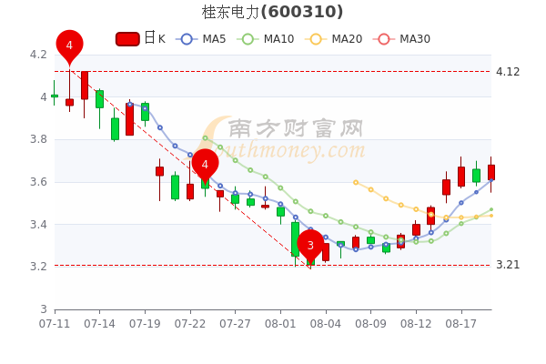 8月19日收盘消息,桂东电力最新报3.68元,成交量52.26万手,总市值为53.94亿元。