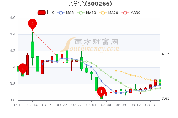 8月19日,兴源环境开盘报价3.85元,收盘于3.79元,跌1.56%。当日最高价为3.91元,最低达3.77元,成交量18.58万手,总市值为59.51亿元。