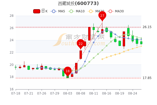 8月26日消息,西藏城投5日内股价下跌8.68%,最新报23.38元,成交量27.98万手,总市值为191.64亿元。