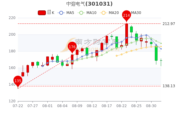 9月1日消息,中熔电气5日内股价下跌16%,最新报168.79元,成交量8858手,总市值为111.87亿元。
