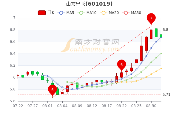 9月1日山东出版开盘报价6.72元,收盘于6.68元。当日最高价为6.73元,最低达6.64元,成交量10.59万手,总市值为139.2亿元。
