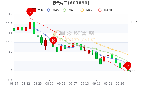 9月28日消息,春秋电子收盘于8.99元,跌3.02%。7日内股价下跌8.82%,总市值为39.34亿元。