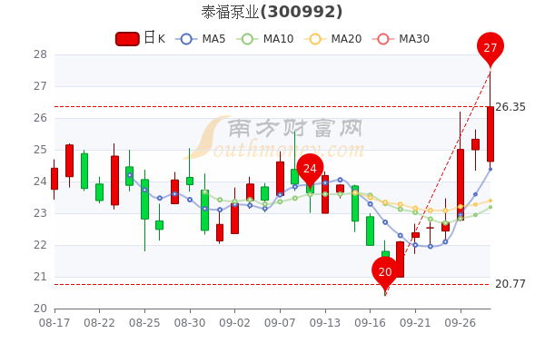 北京时间9月28日,泰福泵业开盘报价24.63元,收盘于25.24元,相比上一个交易日的收盘跌0.36%报25.33元。当日最高价26.2元,最低达24.39元,成交量4.9万手,总市值23.93亿元。