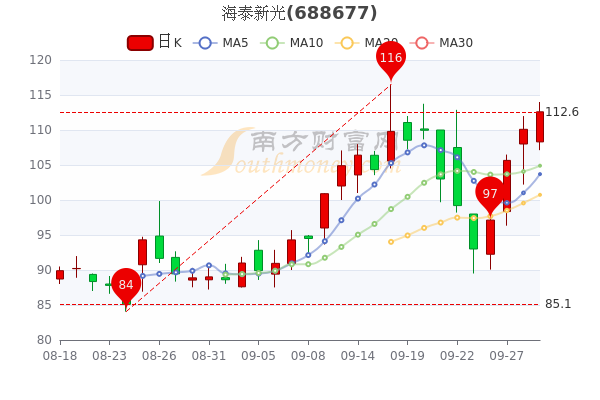 9月29日盘后最新消息,海泰新光7日内股价上涨8.53%,截至收盘,该股涨2.43%报112.77元 。