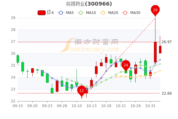 11月2日盘中消息,共同药业最新报价27.170元,3日内股价上涨10.6%,市盈率为36.63。